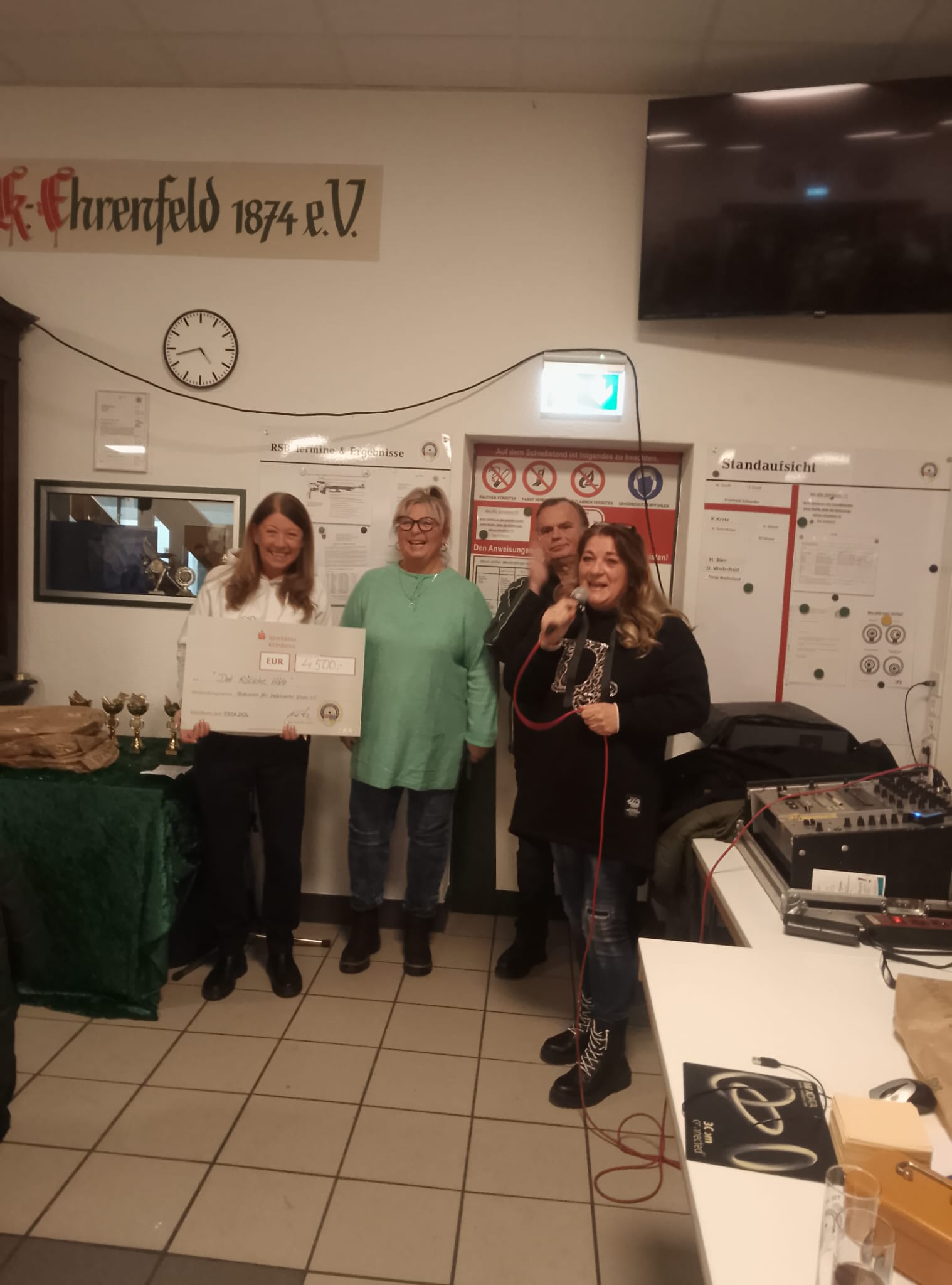 Nach einer kurzen Erklärung über die Zusammensetzung der Spendensumme und vielen Dankesworten konnte Iris Kretz einen symbolischen Scheck über 4.500 Euro an Ruth Rheindorf vom Kölschen Hätz überreichen. Alle Beteiligten waren zu Tränen gerührt und es wurde ihnen mit stehendem Applaus gedankt.